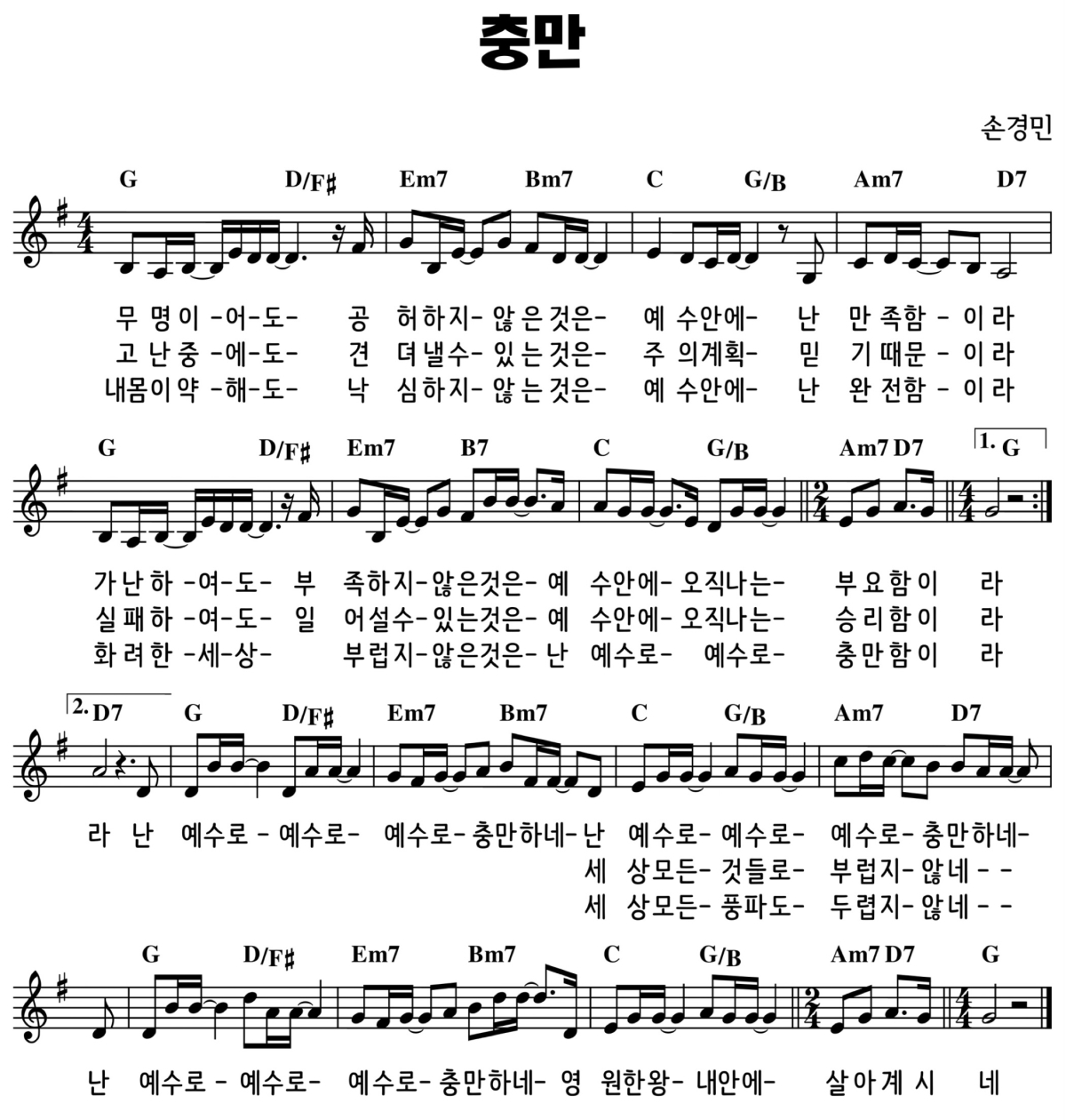 난 예수로 예수로 충만함이라 난 예수로 예수로 예수로 충만하네 세상 모든 것들도 부럽지 않네 난 예수로 예수로 예수로 충만하네 영원한 왕 내 안에 살아계시네