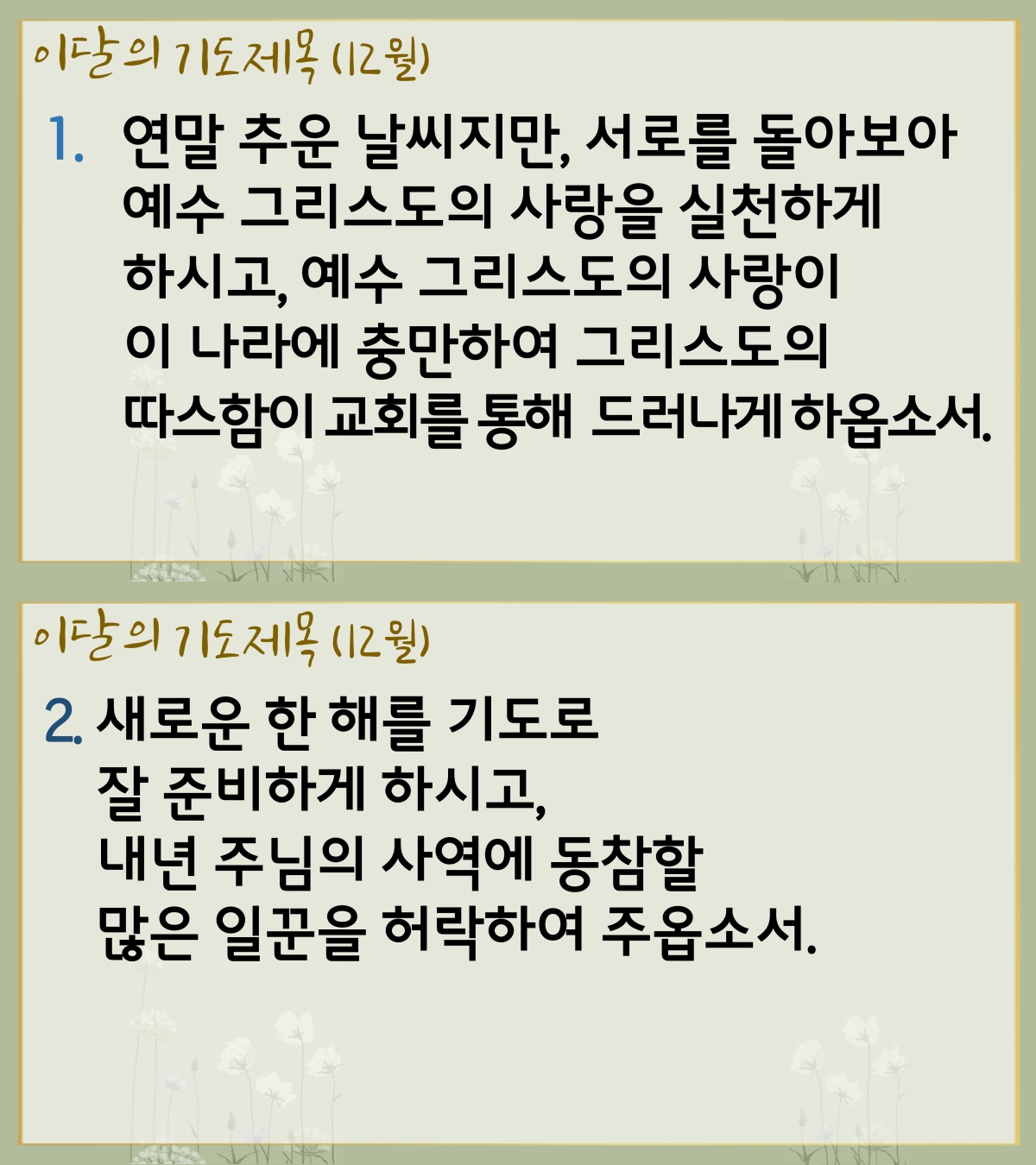 1. 연말 추운 날씨지만, 서로를 돌아보아 예수 그리스도의 사랑을 실천하게 하시고, 예수 그리스도의 사랑이 이 나라에 충만하여 그리스도의 따스함이 교회를 통해 드러나게 하옵소서.