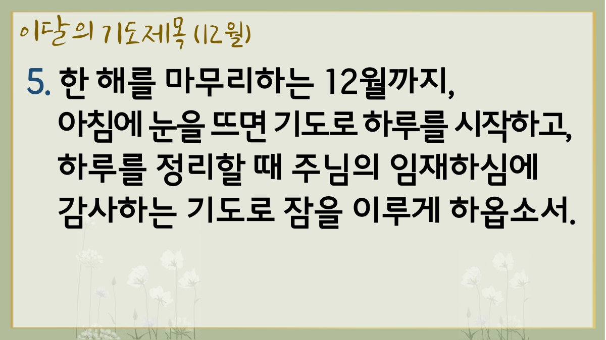 5. 한해를 마무리하는 12월까지, 아침에 눈을 뜨면 기도로 하루를 시작하고, 하루를 정리할 때 주님의 임재하심에 감사하는 기도로 잠을 이루게 하옵소서. |
