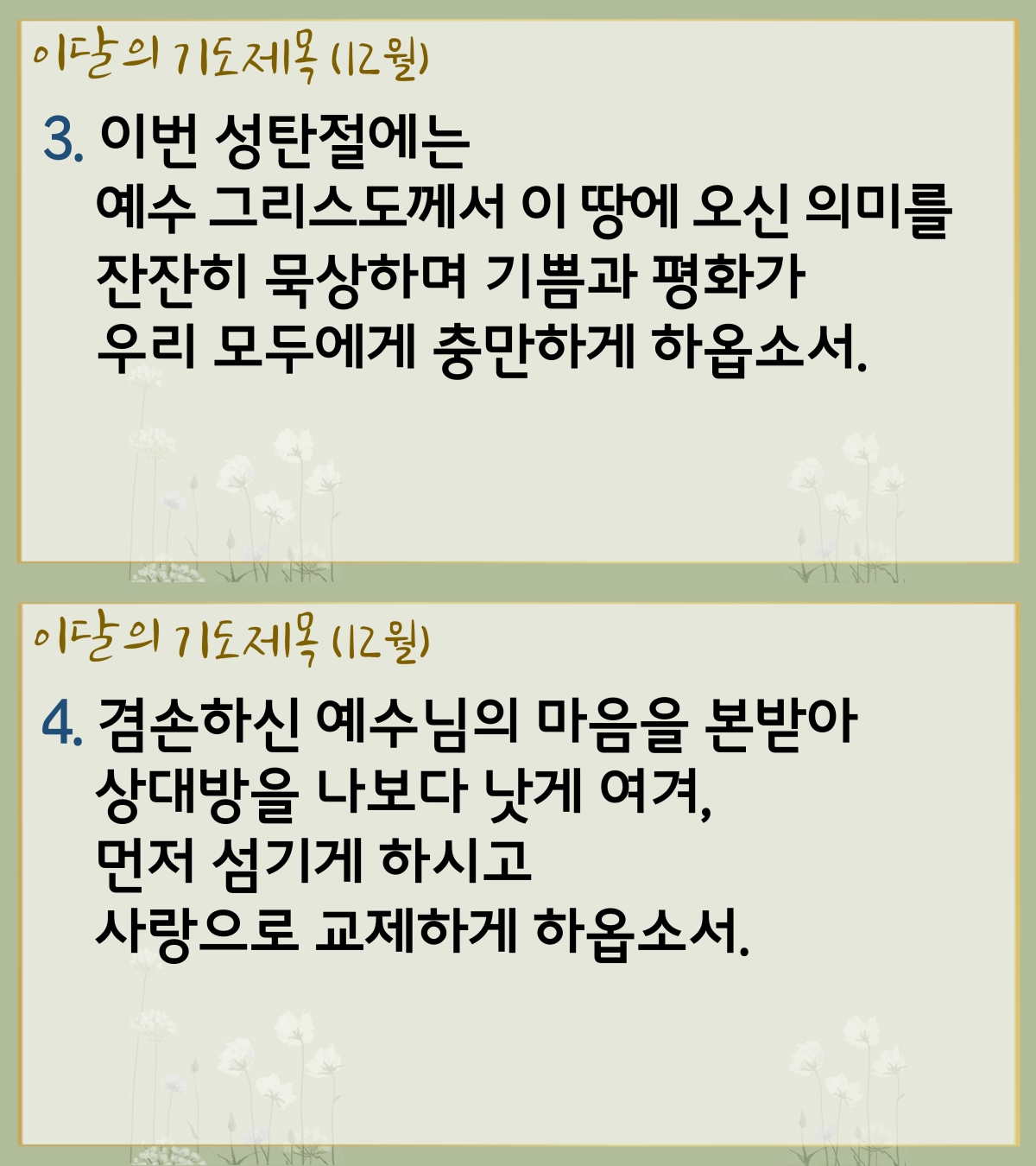 3. 이번 성탄절에는 예수 그리스도께서 이 땅에 오신 의미를 잔잔히 묵상하며 기쁨과 평화가 우리 모두에게 충만하게 하옵소서.