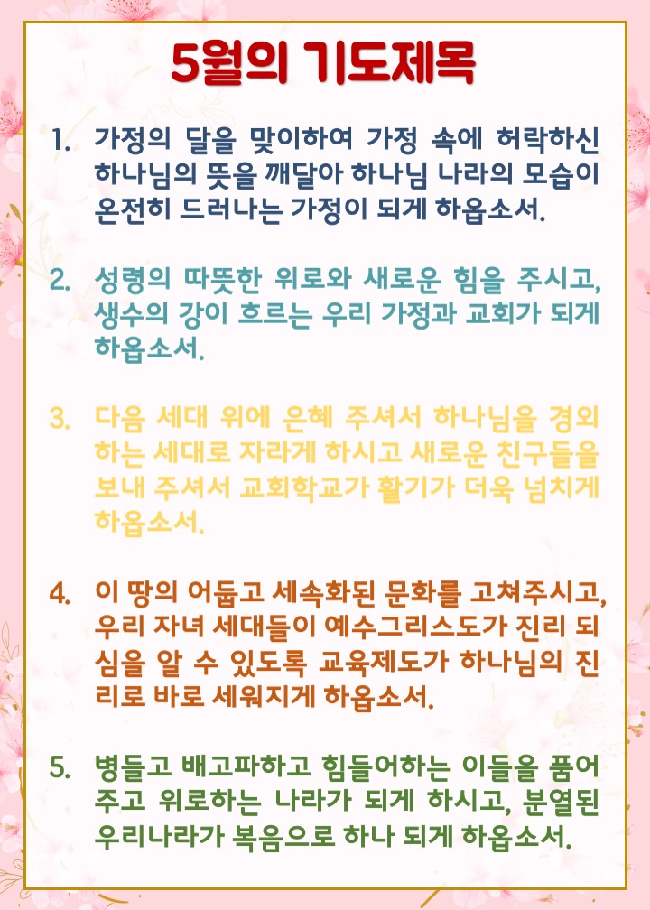 1. 가정의 달을 맞이하여 가정 속에 허락하신 하나님의 뜻을 깨달아 하나님 나라의 모습이 온전히 드러나는 가정이 되게 하옵소서.