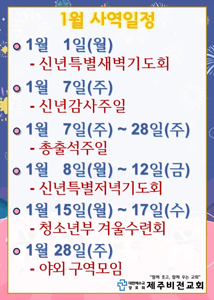 1월 1일(월) 신년특별새벽기도회 1월 7일(주) 신년감사주일 1월 7일(주) ~ 28일(주) 총출석주일 1월 8일(월)~12일(금) 신년특별저녁기도회 1월 15일(월)~17일(수) 청소년부 겨울수련회 1월 28일(주) 야외 구역모임 |